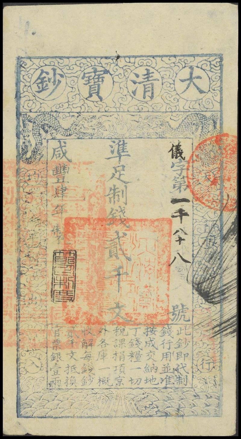 Qing Dynasty, Da Qing Bao Chao, 2000cash, Year 4 (1854), 'Yi' prefix number 1088, vertical format, blue on white, dragons at top, large red Chinese handstamps on obverse,