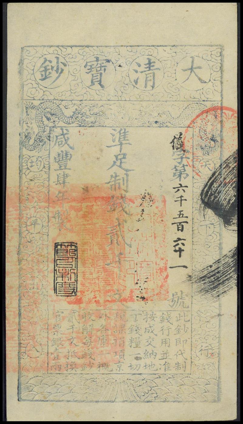 Qing Dynasty, Da Qing Bao Chao, 2000cash, Year 4 (1854), 'Yi' prefix number 6561, vertical format, blue on white, dragons at top, large red Chinese handstamps on obverse and reverse,