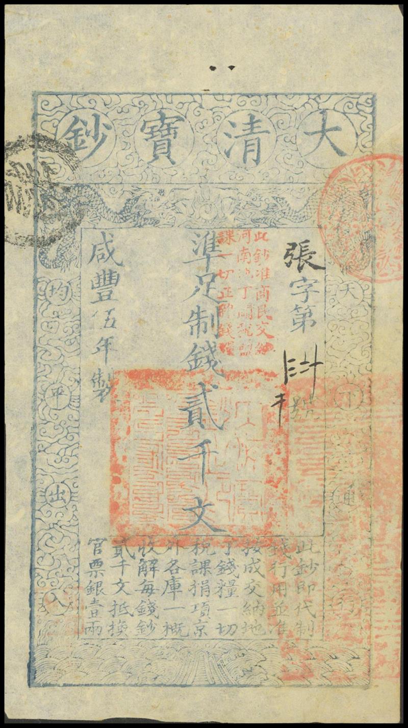 Qing Dynasty, Da Qing Bao Chao, 2000cash, Year 5 (1855), for circulation in Henan Province, 'Zhang' prefix, vertical format, blue on white, dragons at top, large red Chinese seals,