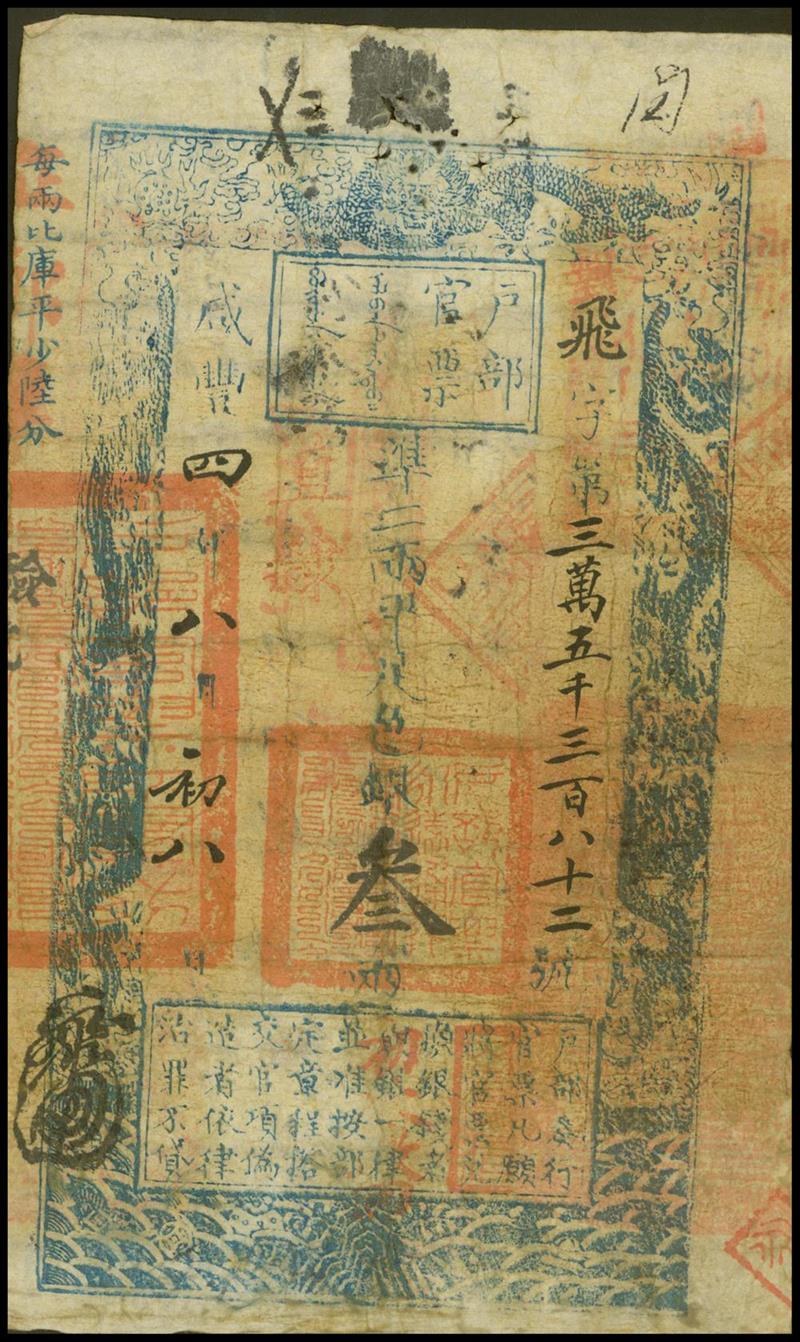 Qing Dynasty, Hu Bu Guan Piao, 3taels, Year 4 (1854), for circulation in Zhili Province, 'Fei' prefix 35382, vertical format, blue on white, dragons at top, large red Chinese seals,
