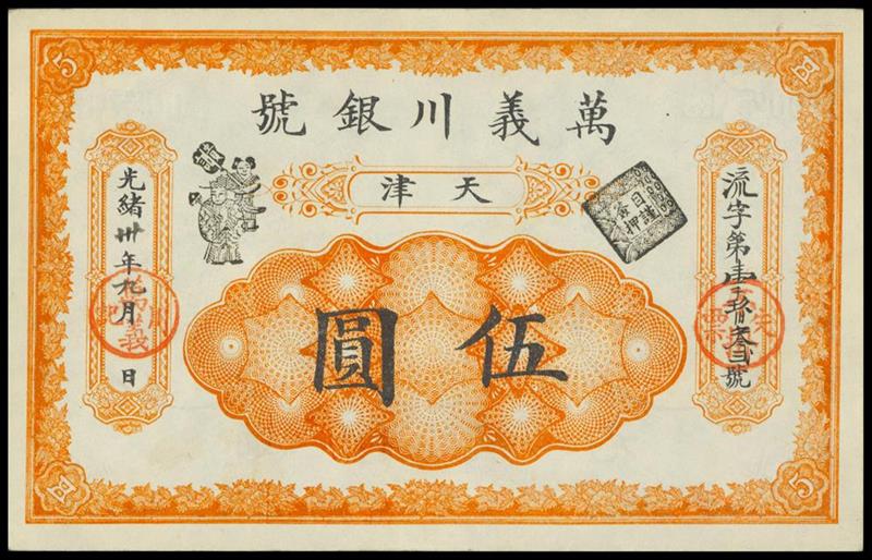 Wan I Chuan, $5, 1904, orange printing, black Chinese text, circular red stamps, purple reverse with the Pei Yang Silver Dollars,