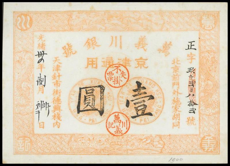 Wan I Chuan, $1, Guangxu era, orange printing, black Chinese text, circular red stamps, plain white reverse with an official stamp,