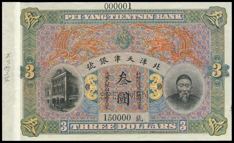 Pei Yang Tientsin Bank, specimen 3 dollars, Tientsin, ND (1910), serial number 000001-150000, pink, green and blue, Li Hung Chan at right, bank building at left, dragon top left and right, reverse blue and yellow, text