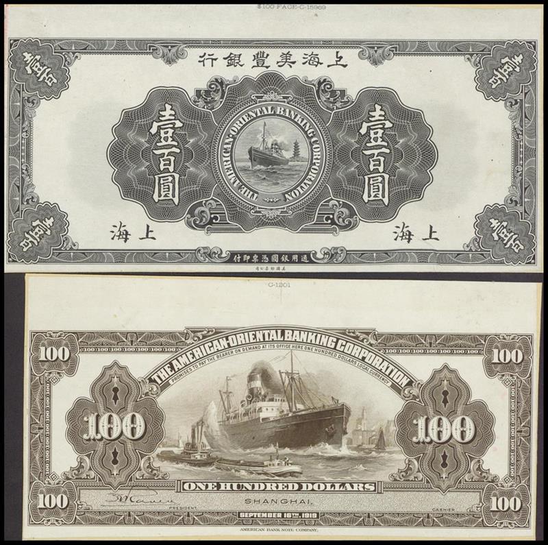 American Oriental Bank of Shanghai, $100, 1919, uniface obverse and reverse die proof on card, black on white, ship, pagoda in background in circle at centre on obverse, reverse freighter, boats at centre,