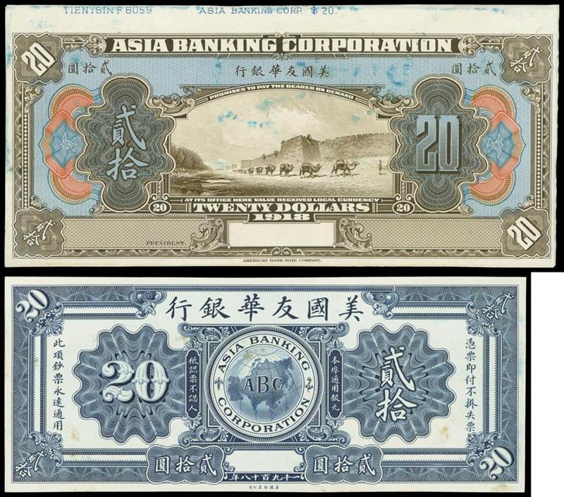 Asia Banking Corporation, China, proof obverse and reverse $20 on card for a $20, Tientsin, 1918, dark brown and pale blue and red, camel train and the Great Wall of China at centre, value at left and right, reverse blue, globe and value