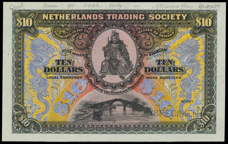 Netherlands Trading Society, specimen/colour trial $10, Shanghai, ND (1909), black, pale blue and pink-orange,. Oriental warrior top centre, bridge low centre, dragon at left and right, value at left and right and at each corner, reverse red and pale blue, dragon at left and right, arms low centre