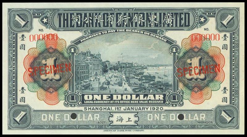 The Bank of Canton Limited, $1, 'Specimen', 1920, Shanghai, serial number '000000', dark grey, view of Shanghai Bund at centre, reverse brown, view of Victoria Harbour at centre, overprinted 'Specimen', and hole punch cancelled,