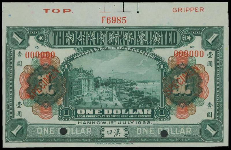 Bank of Canton Limited, $1, 'Specimen', 1922, Hankow, red serial number 000000, green and red, scene of street and pier at centre, reverse blue, scene of Hong Kong Island,