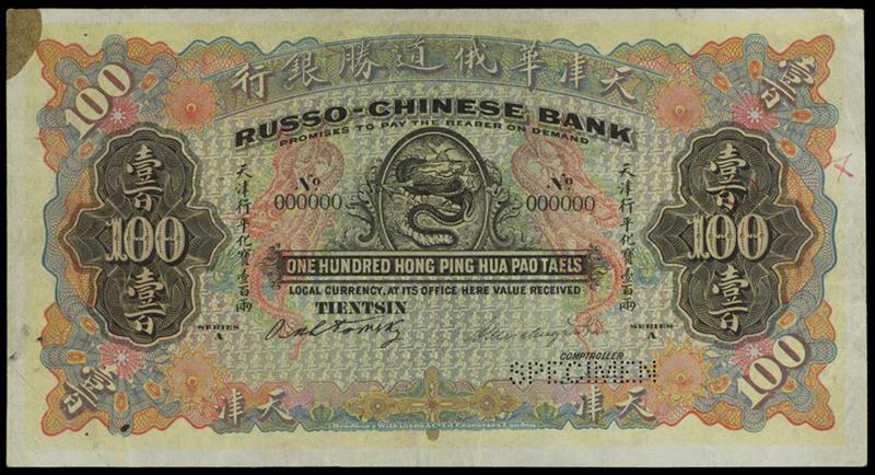 Russo-Chinese Bank, China, specimen 100 hong ping hua pao taels, Tientsin, year 33 (19070, zero serial numbers, red and multicoloured, dragon at centre and at left and right, value at left and right and at each corner, reverse red and multicoloured, bank building at centre, dragon and value at left and right