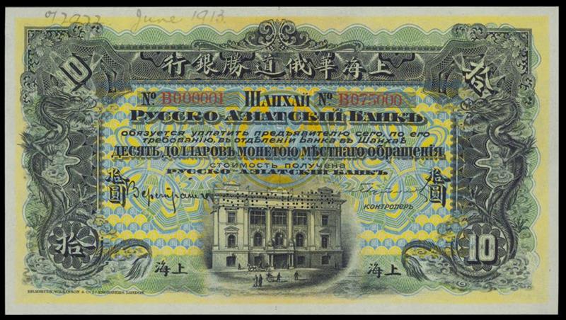 Russo Asiatic Bank, $10, 'Specimen', no date (1914), Shanghai, black, green and yellow, bank building bottom centre, dragons left and right, reverse purple and orange, dragons chasing fireball,