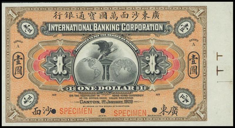 International Banking Corporation, $1, 'Specimen', 1909, Canton, brown on multicoloured underprint, eagle on pediment between two globes, reverse brown,