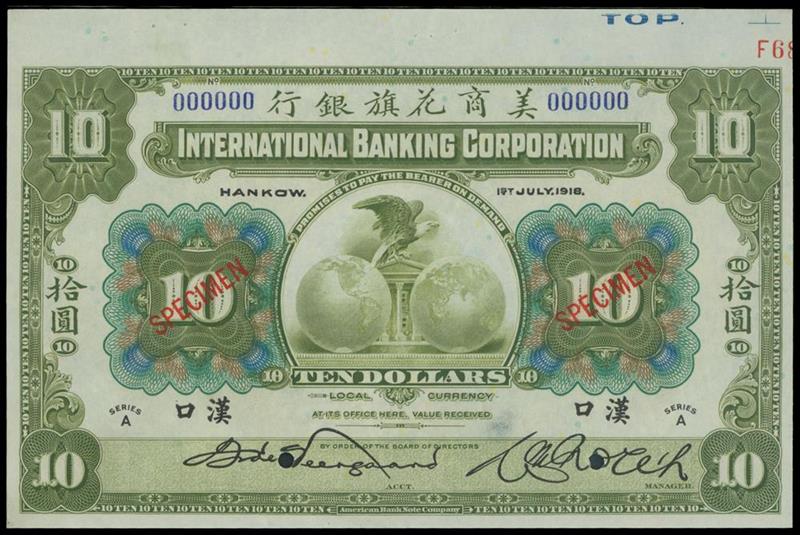International Banking Corporation, $10, 'Specimen', Hankow, 1918, serial number 000000, green and multicolour, twin globes and eagle at centre, reverse blue green, twin globes and eagle at centre,