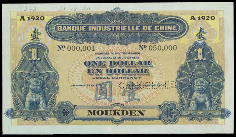 Banque Industrielle de Chine, China, specimen $1, Moukden, 1920, serial number 000001-050000, blue and pale brwn, ornamental lion low left and right, reverse purple, ornate multiple gateways at top centre