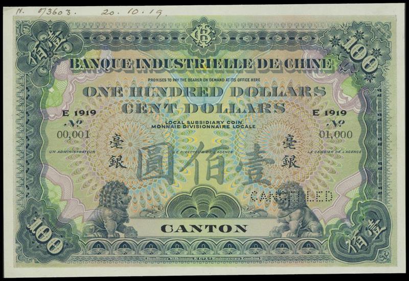 Banque Industrielle de Chine, $100, 'Specimen', 1914-1919, Canton, grey-green and multicoloured, values at four corners, ornamental lions at bottom, Great Wall on reverse,
