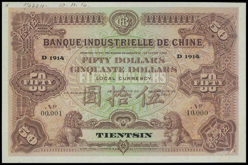Banque Industrielle de Chine, $50, 'Specimen', 1914, Tientsin, purple, green and multicoloured, values at four corners, ornamental lions at bottom, pagoda on reverse,