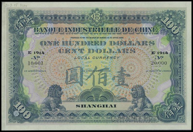 Banque Industrielle de Chine, $100, 'Specimen', 1914, Shanghai, grey-green and multicoloured, values at four corners, ornamental lions at bottom, Great Wall on reverse,