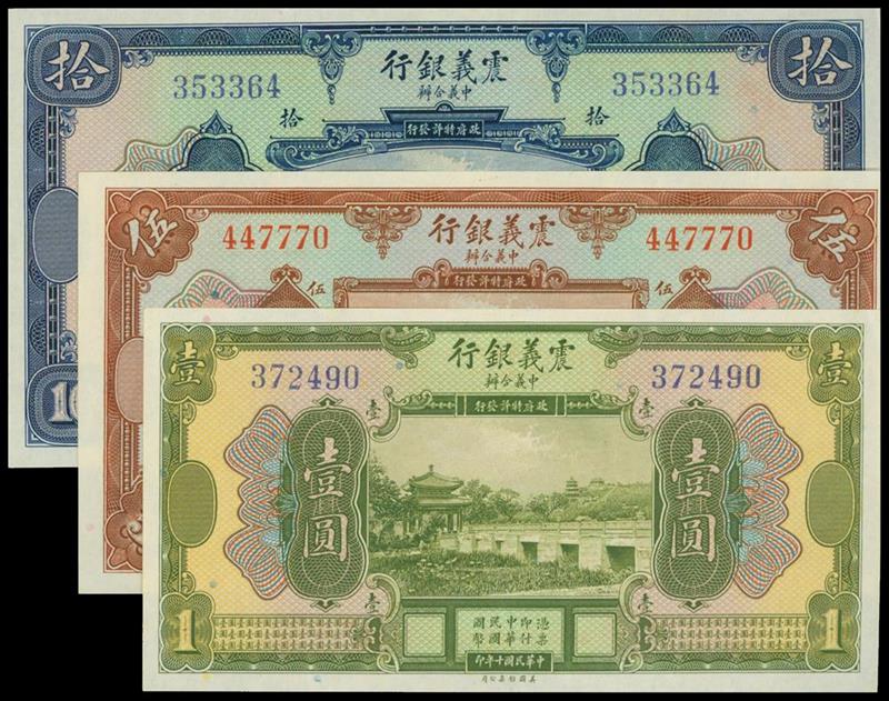The Chinese Italian Banking Corporation, set of 1, 5 and 10yuan, 1921, green, brown and blue respectively,