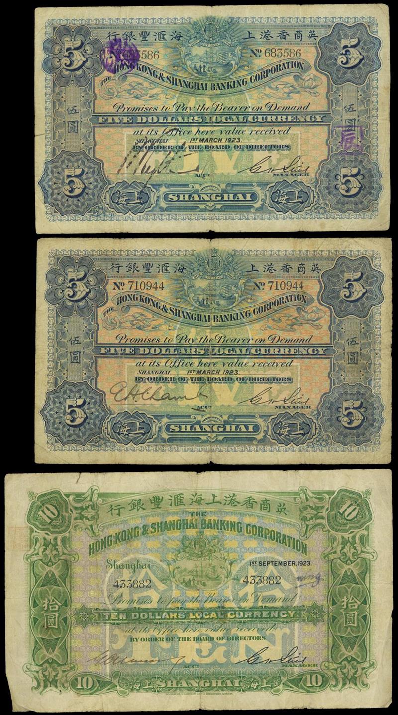 The HongKong and Shanghai Banking Corporation, group of 3 notes consisting of 2x $5 and $10, 1923 Shanghai, serial numbers 683586, 710944 and 433882, blue and green respectively,