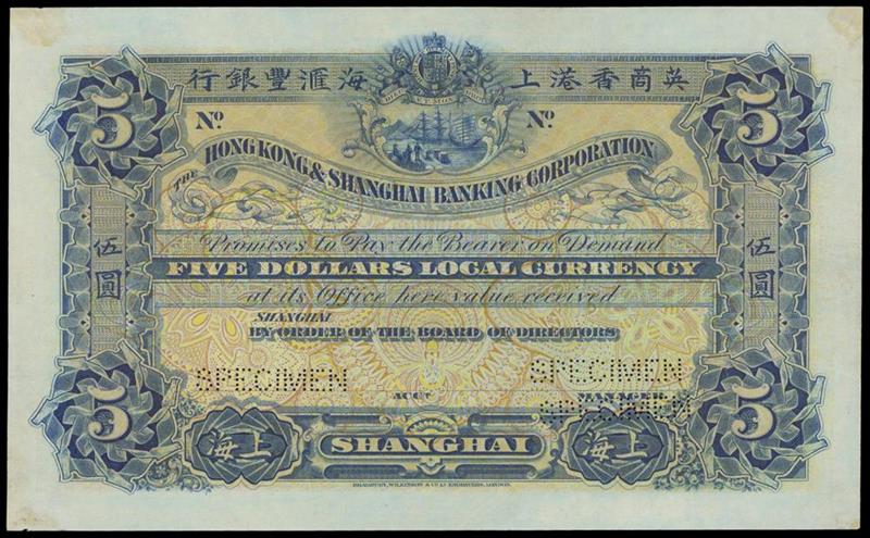 Hong Kong and Shanghai Banking Corporation, China, specimen $5, Shanghai, ND (ca 1904), blue and pale yellow and brown, arms top centre, value at centre and at each corner, reverse red, maiden (Ceres) and cherubs, value at each corner