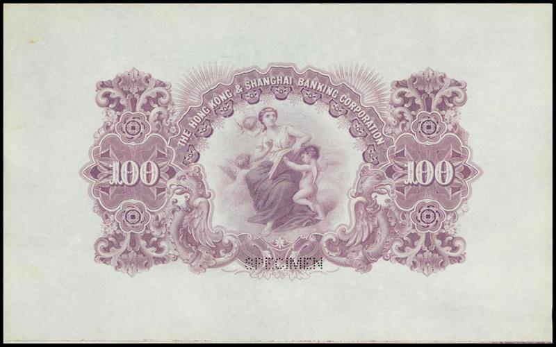The HongKong and Shanghai Banking Corporation, $100, colour trial of the reverse, purple, allegorical figure of a woman with three cherubs, ornate guilloche left and right, '100' within,