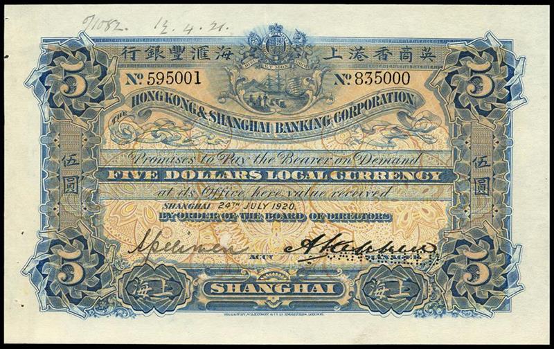 Hong Kong and Shanghai Banking Corporation, specimen $5, Shanghai, 24 July 1920, serial number 595001-835000, blue and orange-pink, arms top centre, value at centre and at each corner, printed signature of A.G.Stephen low right, reverse purple, cherubs and allegorical symbols, value at left and right