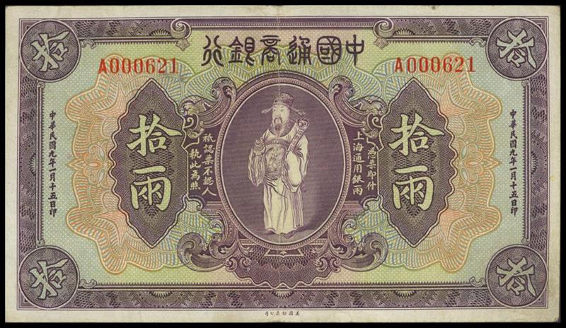 The Commercial Bank of China, 10taels, 1920, serial number A000621, purple and multicoloured, God Of Wealth at centre, reverse brown, bank seal flanked by lions at centre,