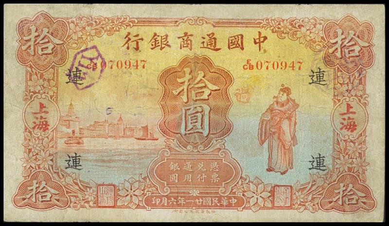 The Commercial Bank of China, $10, Shanghai, 1932, serial number E/CB 070947, red and multicolour, God of Wealth at right, harbour scene at left, reverse red, medallionsupported by two lions at centre,