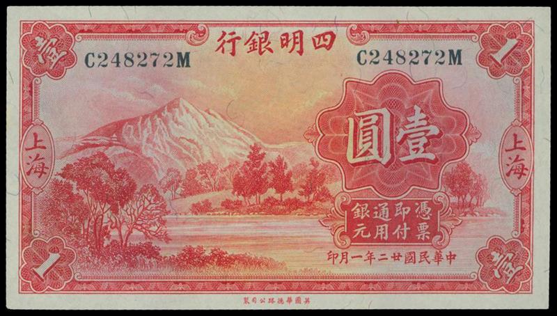 Ningpo Commercial and Savings Bank, $1, 1933, Shanghai, green serial number C248272M, red, mountain landscape at left, reverse green,