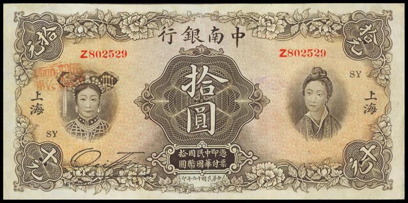 China and South Sea Bank Limited, $10, Shanghai, 1927, red serial number Z 802529, brown and pale orange, Chinese maiden at left and right, reverse brown and pale green, three women in field, value in green underprint at left and right,