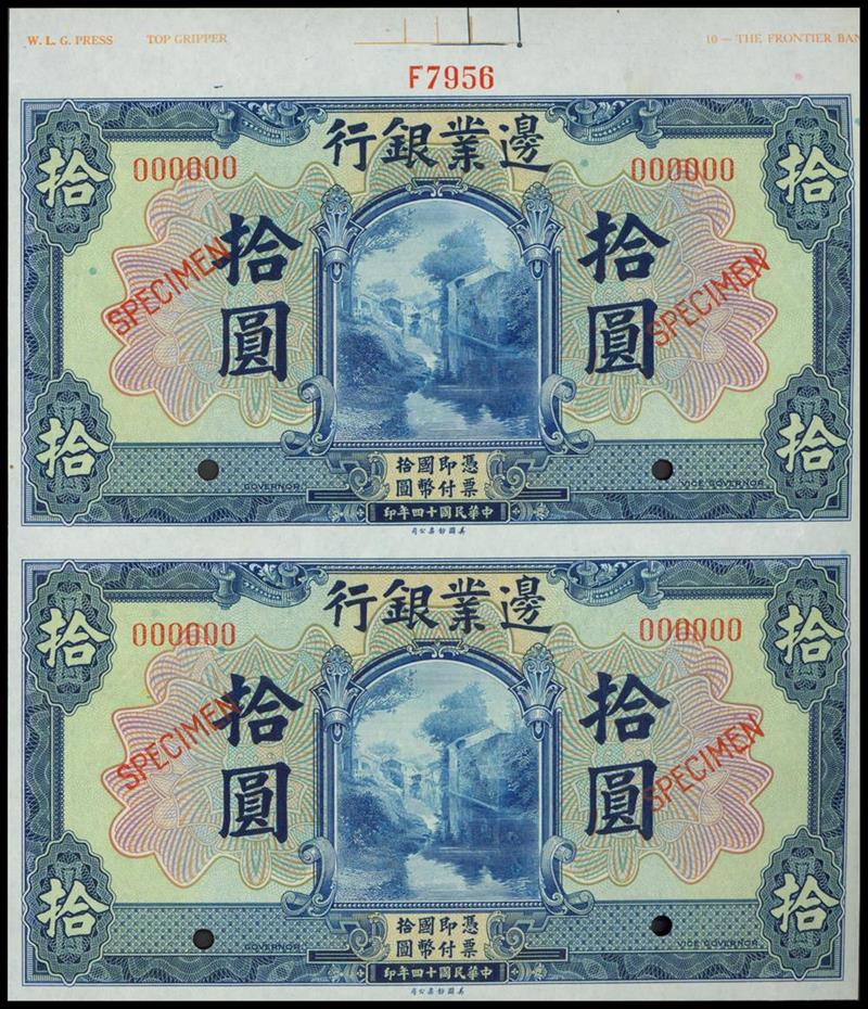 The Frontier Bank, uncut sheet of two 10 Yuan, ' Specimen', 1925, red serial number 000000, blue on multicoloured underprint, river at centre, reverse blue, value,