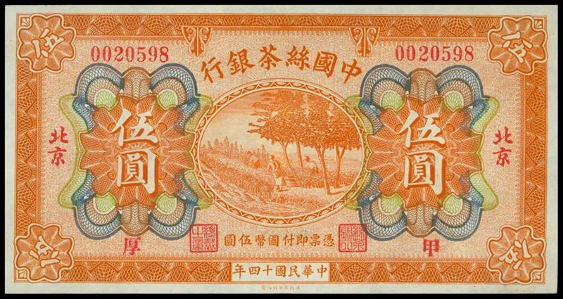 China Silk and Tea Industrial Bank, 5yuan, 1925, Peking, serial number 0020598, orange and multicoloured, tea harvesting at centre,