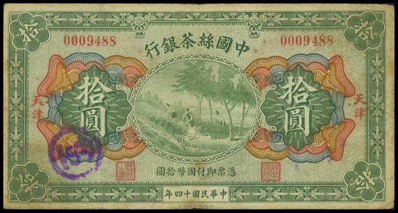 China Silk and Tea Industrial Bank, 10yuan, 1925, Tientsin, serial number 0009488, green and multicoloured, tea harvesting at centre,