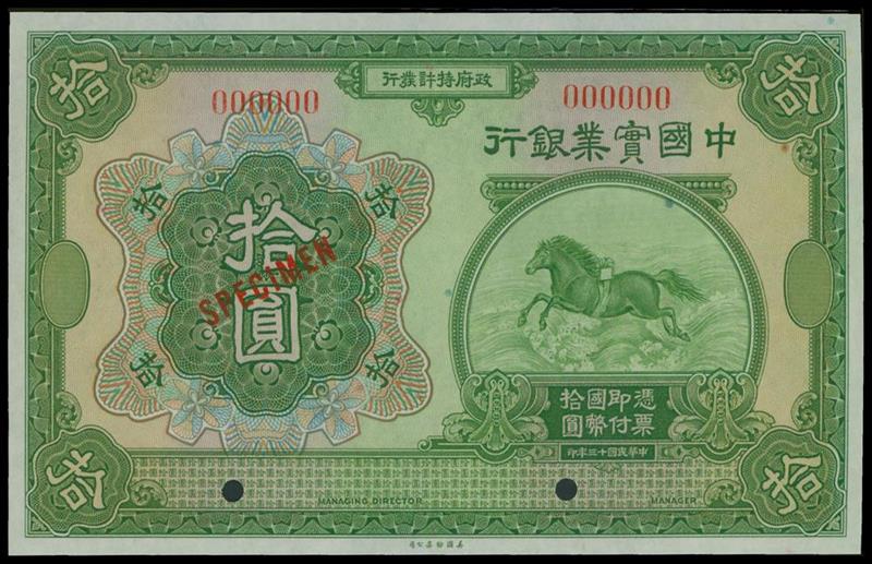 National Industrial Bank of China, 10 Yuan, 'Specimen', 1924, green on multicoloured underprint, running horse at right, reverse green, Great Wall at centre,