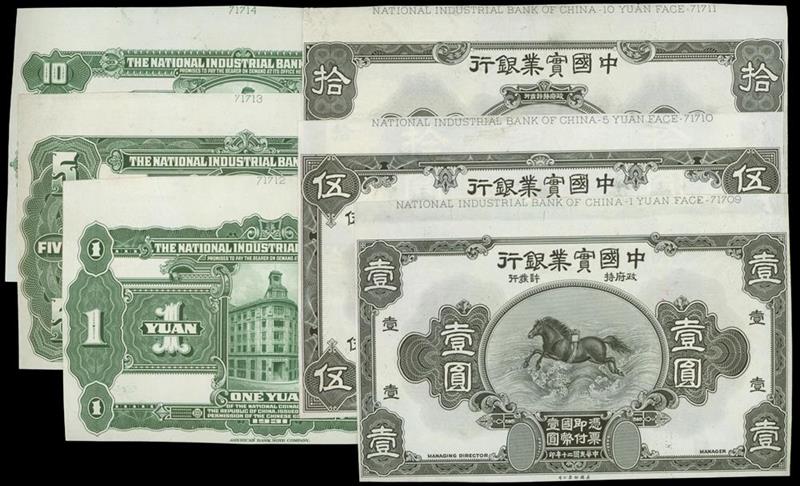National Industrial Bank of China, set of 1,5, and 10yuan uniface obverse and reverse die proofs, the obverses black and white, and the obverses green, galloping horse at centre,
