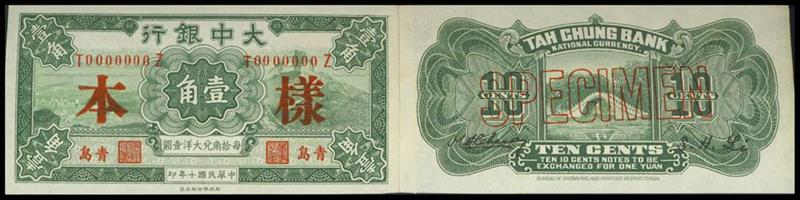 Tah Chung Bank, 10cents, uniface obverse and reverse 'Specimen', Tsingtau, green, Great Wall at right, stuck side by side, the plain white reverse has the chopmark and New Year salutations from Lu Shibo, a famous Chinese banknotes collector,
