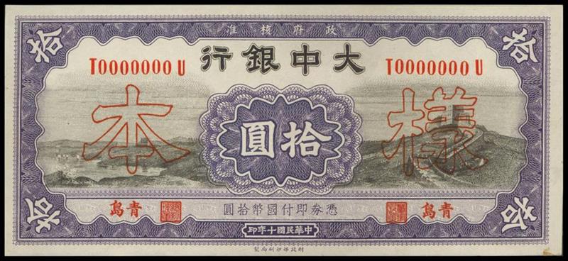 Tah Chung Bank, 10yuan, uniface obverse and reverse specimen, 1921, Tsingtau, purple and black, Great Wall at right,