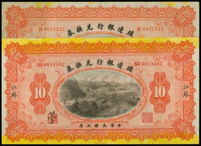 The Bank of Territorial Development, lot of 2x $10, 1914, Kiangsu and Shanghai, serial number SU0013402 and S0027522, red and black, road building at centre,