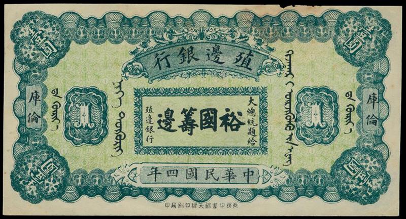 Bank of Territorial Development, $1, 1915, Kulun (Urga), serial number 39144, black text on green, Russian text on reverse,