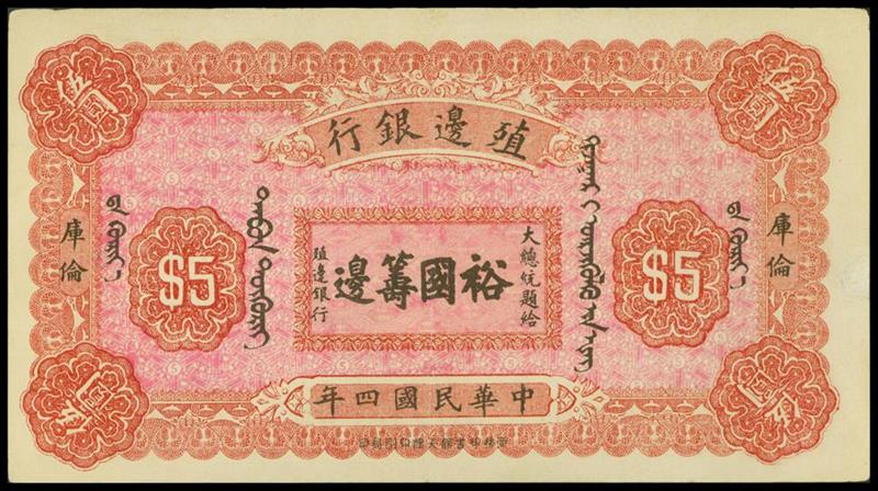 Bank of Territorial Development, $5, 1915, serial number 06603, 'Urga', brown and black on pink underprint,