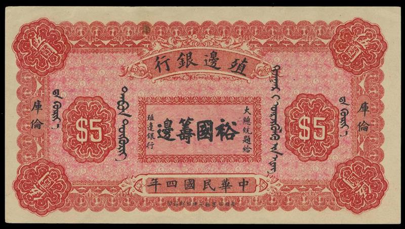 Bank of Territorial Development, $5, 1915, Kulun (Urga), serial number 07677, black text on red-brown, Russian text on reverse,