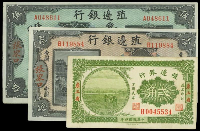 The Bank of Territorial Development, lot of 3 notes, 2jiao 1915, 1yuan and 5yuan 1916, Kalgan, (Pick 571, 582a and 583a), very fine, uncirculated and almost uncirculated, the 5yuan has a few very small pinholes left border, scarce types (3).