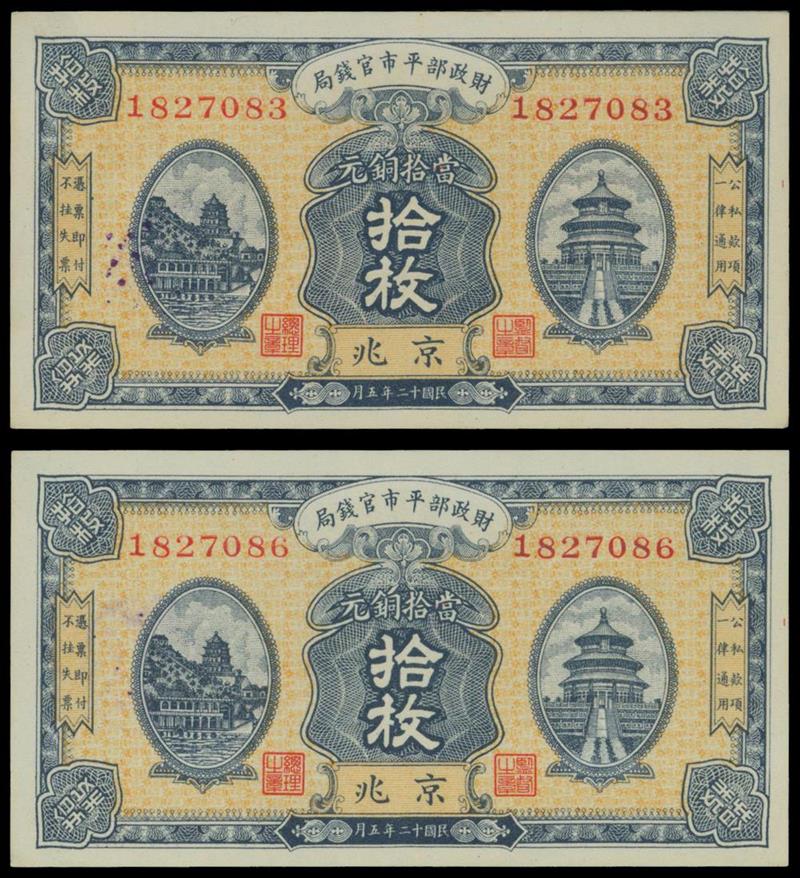 Market Stabilisation Currency Bureau, pair of 10coppers, 1915, Ching Chao, serial numbers 1827083 and 1827086, blue and yellow, Temple of Heaven at right, Summer Palace at left,