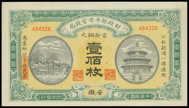 Market Stabilisation Curerncy Bureau, 100coppers, 1915, Anhwei, serial number 484328, green, orange and black, Temple of Heaven at right, hillside pagoda at left, red seal signatures, reverse red,