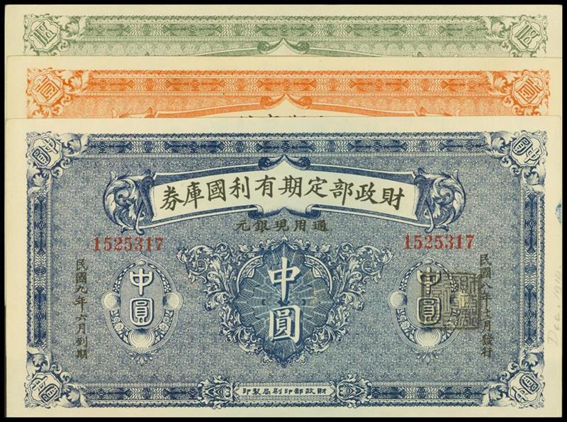 Fixed Term, Interest Bearing Treasury Notes, set of 3, 1/2yuan, 1yuan and 5yuan, all issued in Auguat 1919, blue, orange and green respectively,