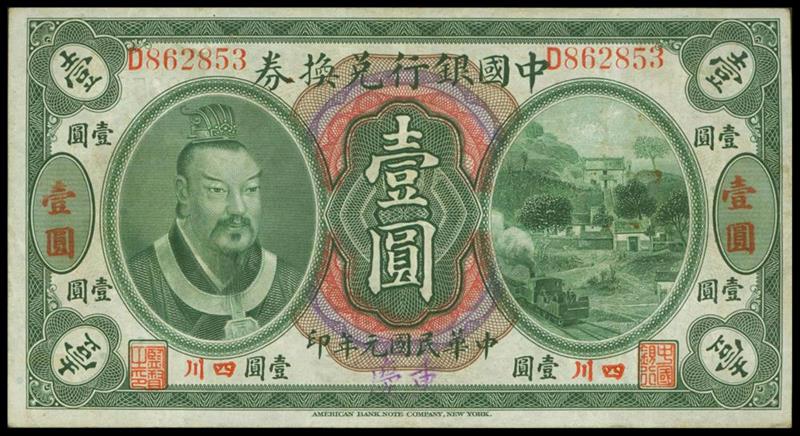 Bank of China, $1, 1912, Szechuan, serial number D862853, green and multicoloured, Huangdi at left, hillside village scene at right, overprinted 'Szechuan' in red and stamped 'Chongqing' bottom centre, reverse green, overprint in black English text,