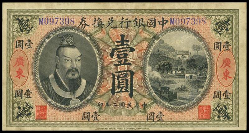 Bank of China, $1, 1913, Canton, serial number M097398, olive and red, Huangdi at left, hillside village at right, reverse red, waterfront park at centre,