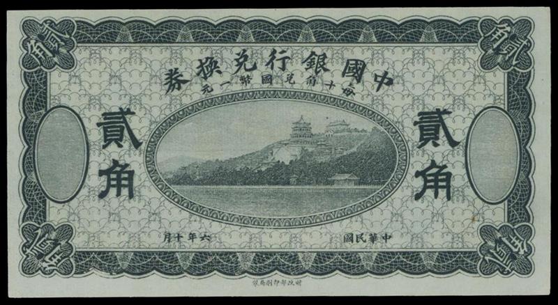 Bank of China, 2jiao remainder, 1917, black, Summer Palace at centre, reverse brown, English text,
