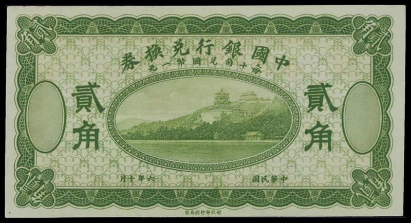 Bank of China, 2jiao remainder, 1917, green, Summer Palace at centre, reverse lilac, English text,