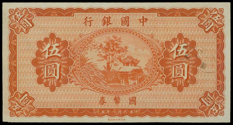 Bank of China, 5yuan, unissued remainder, 1919, orange, pavilion at centre, reverse black on yellow, English text,