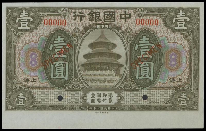 Bank of China, 1 Yuan, 'Specimen', 1918, Shanghai, red serial number 00000, black-green on multicoloured underprint, Temple of Heaven at centre, reverse blue,